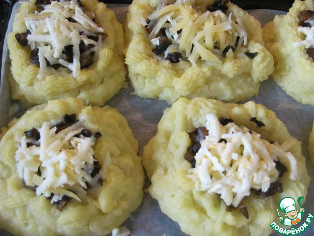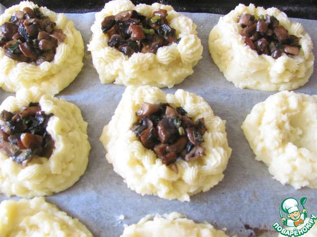 Кладём внутрь начинку из грибов и ставим в разогретую духовку до 210 гр. на 15-20 мин. Так как картофельное пюре и начинка готовые, то наша цель - это подрумянить наши гнёздышки.