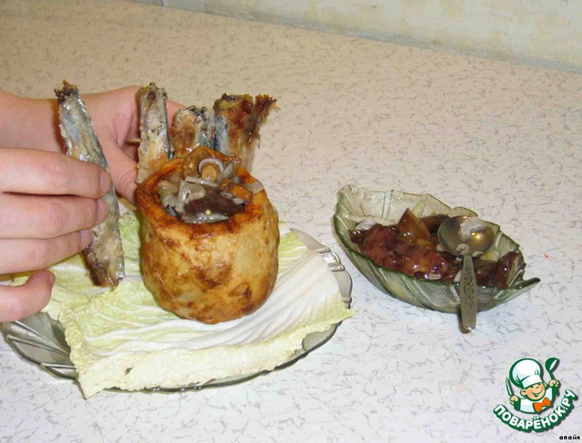 Я закрепила мойву листочком от салата (можно зеленым луком).