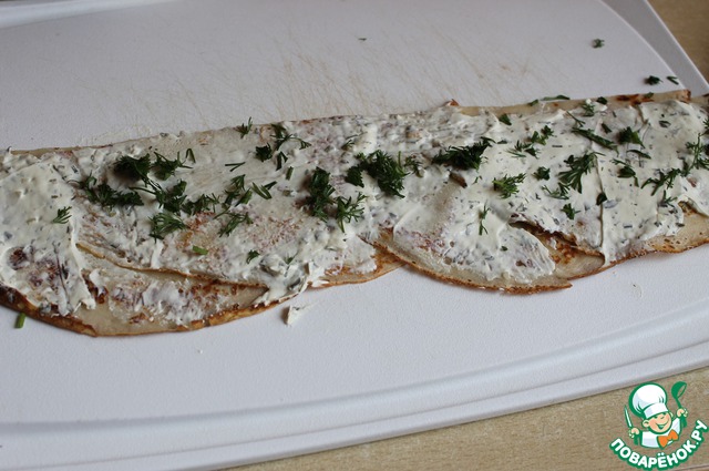 Теперь берем любой сыр, у меня Филадельфия, она была уже с травкой но я еще порезала укроп..