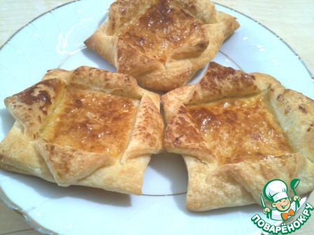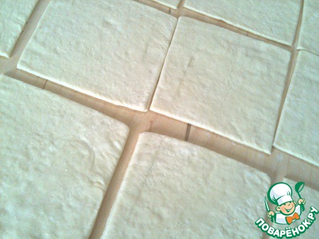 Слоеное дрожжевое тесто разморозить. Раскатать его в прямоугольник толщиной 0,3-0,5 см. Порезать на равные квадраты размером примерно 8х8 см.