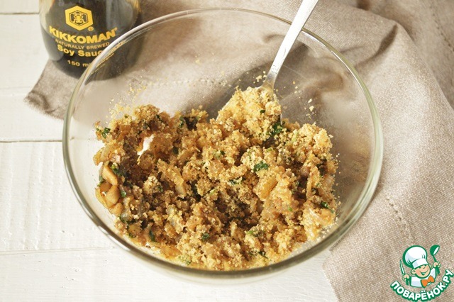 Пересыпаем крошки к грибной начинке и аккуратно перемешиваем.