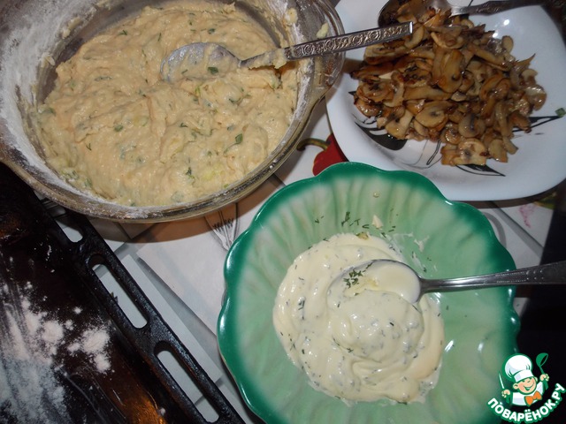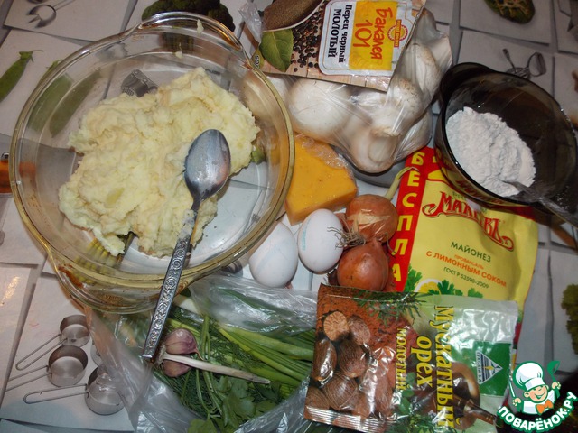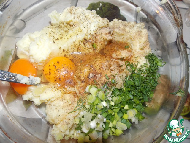 Пока жарятся грибы, делаем картофельное тесто: к мятому картофелю добавляем соль, перец, мускатный орех и яйца... Все перемешиваем.