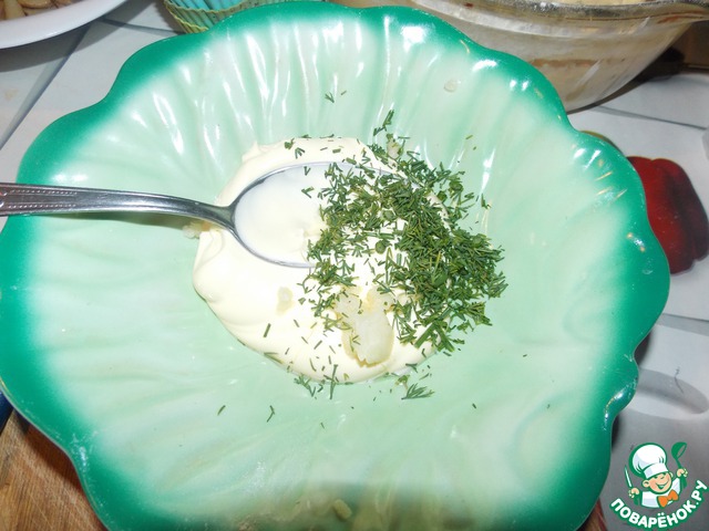 Затем в майонез добавляем чеснок и укроп. И перемешиваем. Это будет соус.