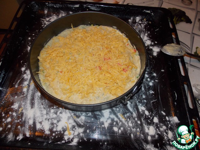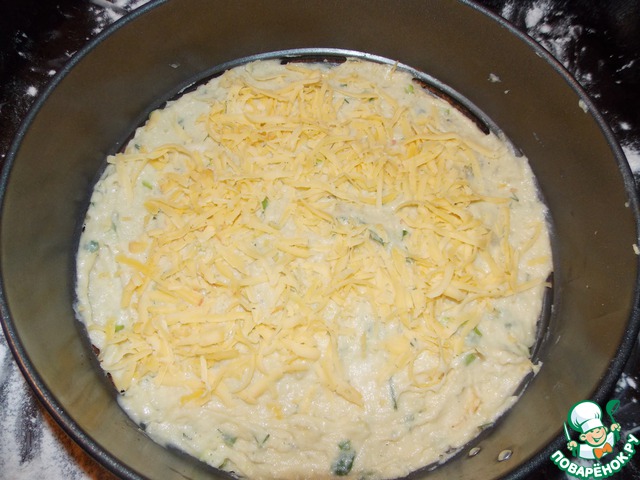 1 слоем выкладываем половину картофельного теста и сверху натрем половину сыра.