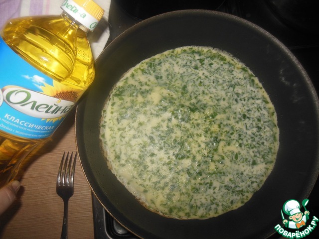 Сначала приготовим блины. Для этого соединяем яйца с молоком, затем добавляем сахар и соль, масло, и постепенно муку. Зелень мелко крошим и добавляем в тесто. Жарим блины на разогретой и смазанной сковороде с двух сторон. Получается 5 блинчиков.