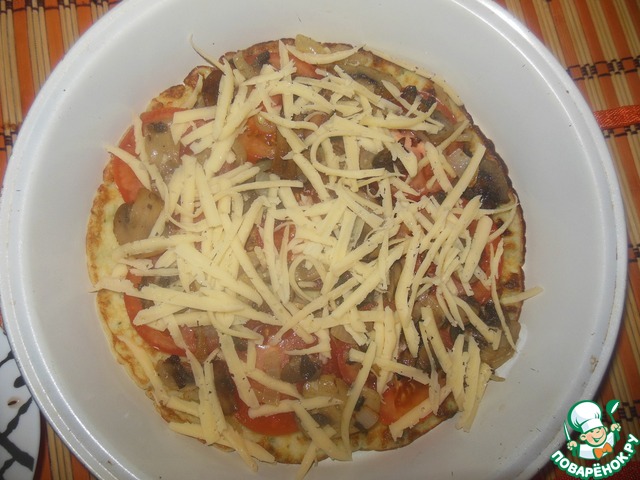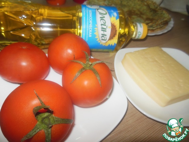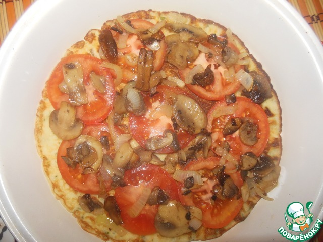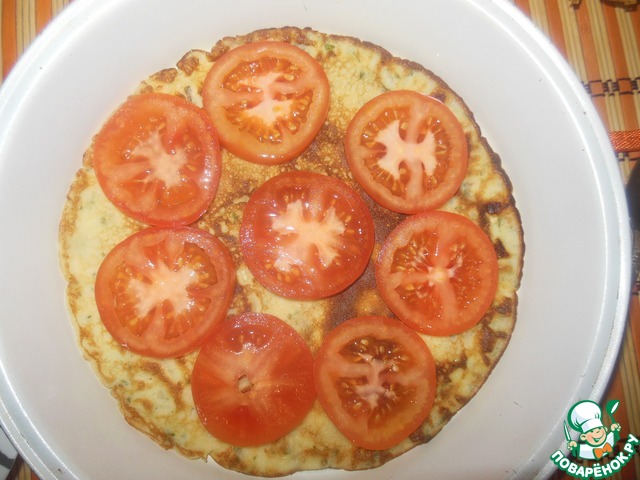 Для этого в форму выкладываем блин, на него кружочки наших помидоров
