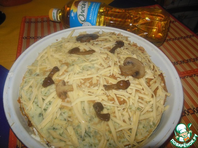 Верхний блин посыпаем только сыром. И отправляем в духовку разогретую до 180 градусов на 15-20 минут.