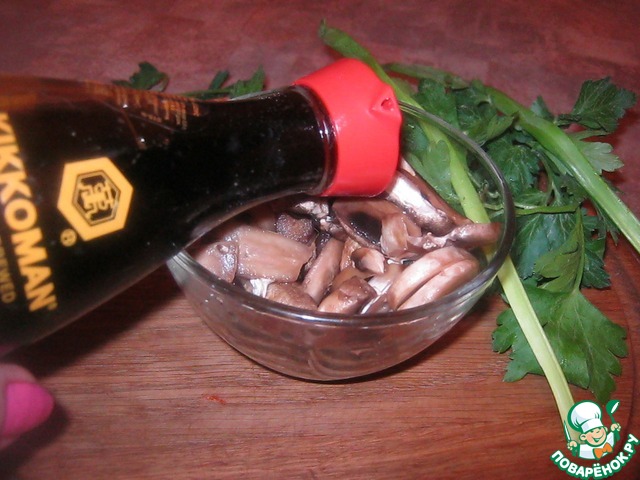 Грибы разморозила. нарезала, замариновала в соевом соусе ТМ "Kikkoman"на 30 минут