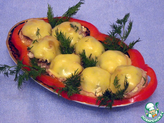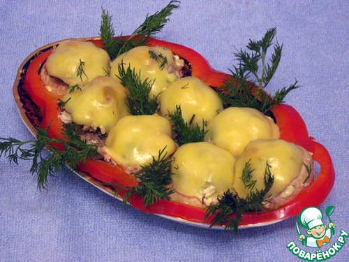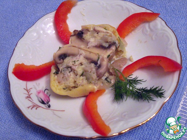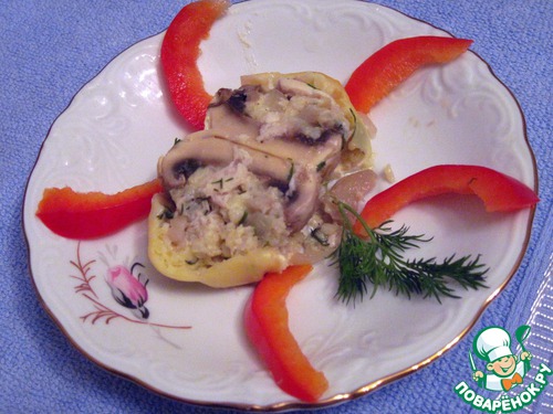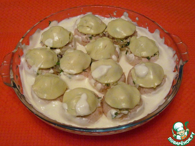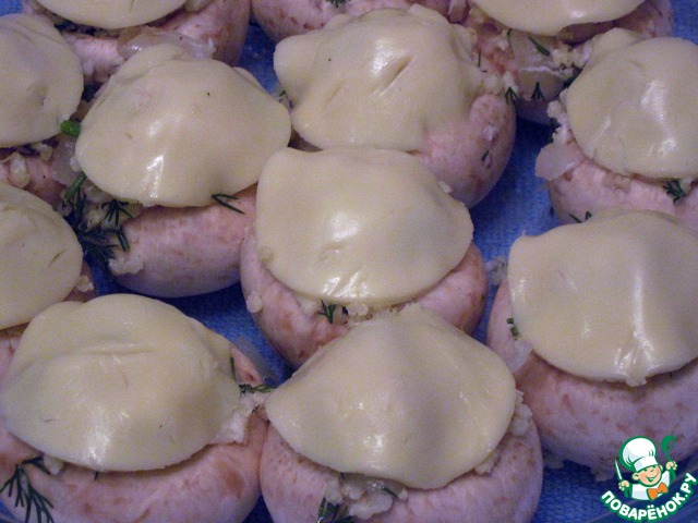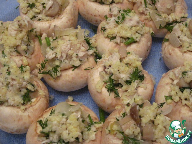 Положить шляпки грибов в смазанную маслом форму. Наполнить их начинкой.