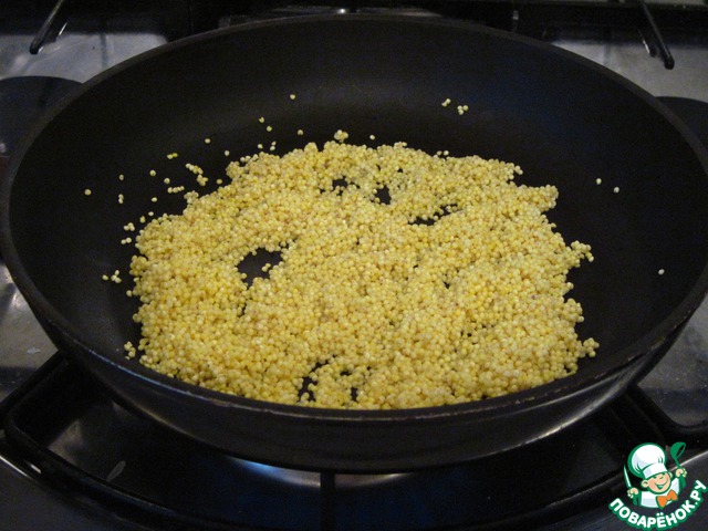 Обжарить крупу на сухой разогретой сковороде в течении 4 минут.