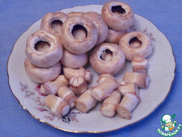 Грибы помыть, обсушить. Отделить ножки и мелко их нарезать, шляпки отложить.