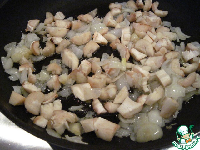 Луковицу очистить, мелко порезать и слегка обжарить на масле, добавить порезанные ножки грибов и еще немного обжарить до готовности грибов.