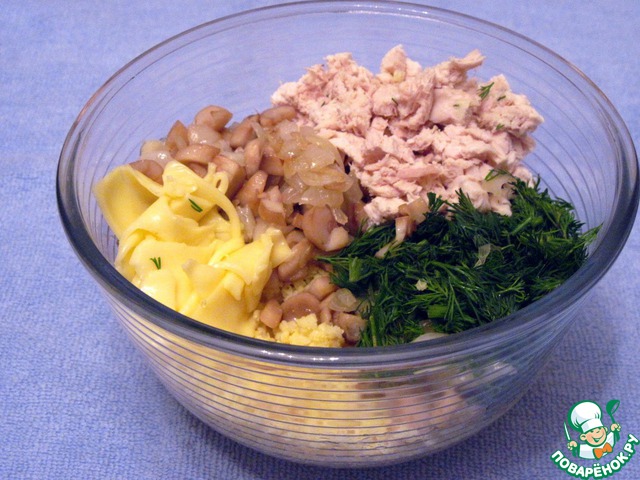 Отварное куриное мясо нарезать маленькими кубиками. Обрезки от сыра измельчить, перемешать с крупой, куриным мясом, измельченной зеленью укропа, обжаренными луком и грибами. Поперчить, посолить. Тщательно перемешать.