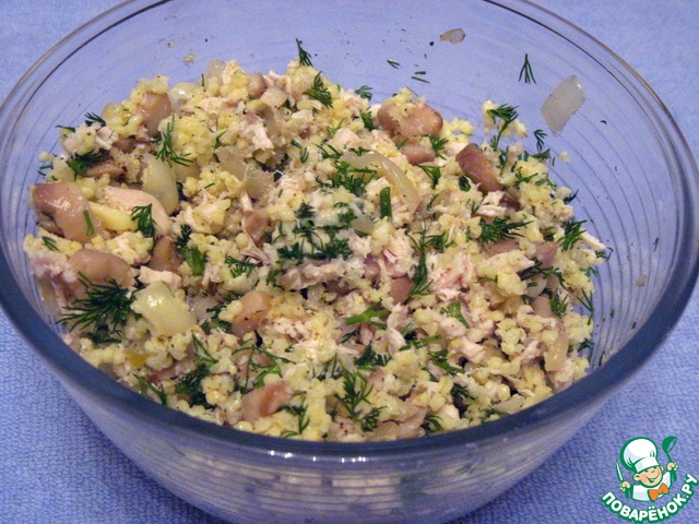 Нежнейшая начинка для грибов готова. Пшенная крупа смягчает вкус начинки, делает ее более легкой.