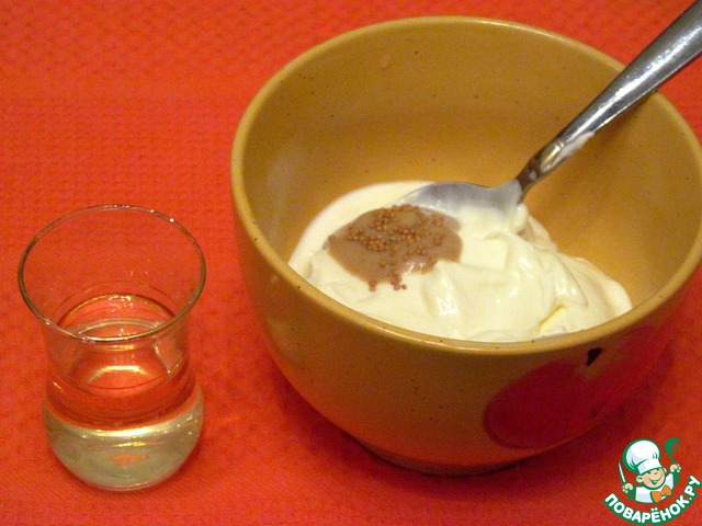 Приготовить соус. Смешать сметану с горчицей и вином. Посолить, поперчить.