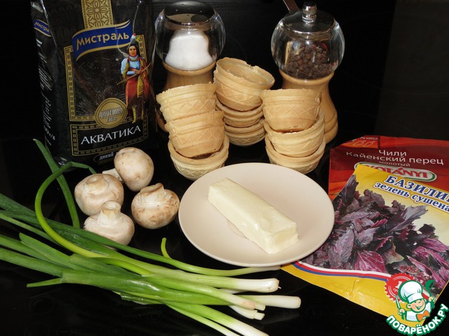 Приготовим рис, грибы, масло, соль, перец, зеленый лук, корзиночки, базилик.