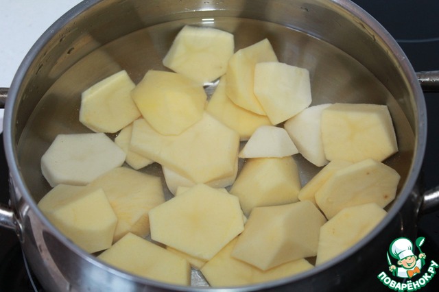 Картофель делим на 3 части. Делаем три овощных мусса. Блендером (измельчителем) не погружным взбиваем картофель с свеклой и получаем один мусс. Также взбиваем картофель с морковью и получаем второй мусс. Взбиваем картофель с огурцами и зеленью и получаем третий мусс.