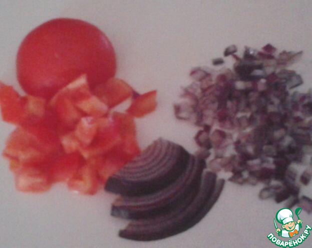 Помидор очищаем от кожицы. Мелко режем помидор и лук.