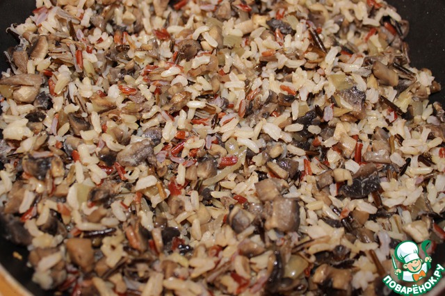 Рис отварить до готовности. Лук почистить, мелко нарезать и пассеровать на сливочном масле. Грибы измельчаем и добавляем к луку, помешивая; продолжаем приготовление до полной готовности грибов. Остывшие рис и грибы перемешиваем.