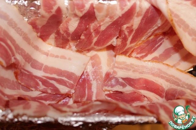 Форму для запекания выстелить фольгой. На фольгу выкладываем полоски бекона.