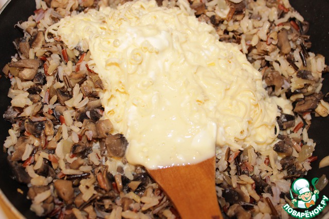 Сыр натереть на мелкой терке, добавить к взбитому яйцу и сливкам, все хорошо перемешать. Полученную смесь отправляем к рису с грибами и опять все перемешиваем.