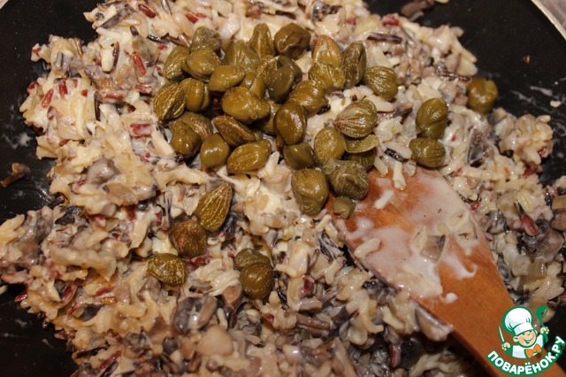 Добавляем каперсы. Все аккуратно ыкладываем в форму с беконом и отправляем в духовку на 1 час.