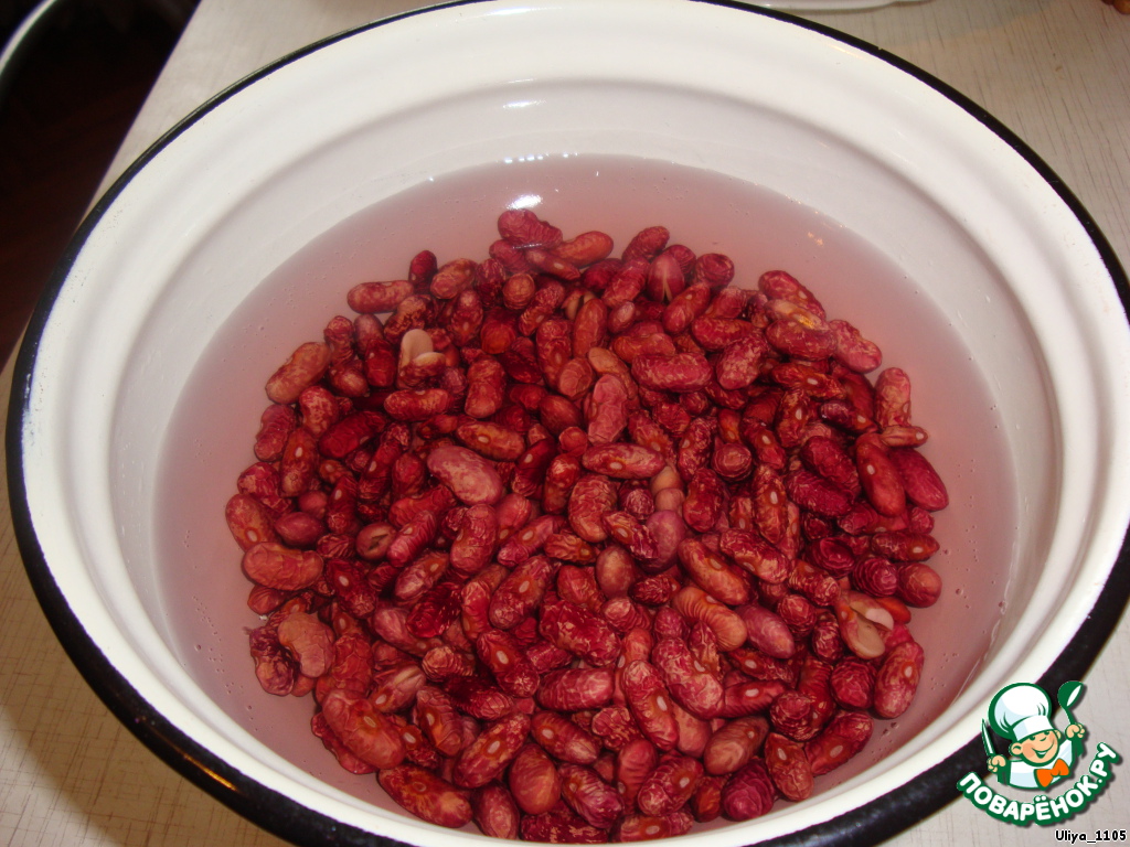 Сухую фасоль замочить как минимум на 2ч, а лучше на ночь, в холодной воде. Затем ту воду слить, и снова залить фасоль холодной водой на 2-3см выше уровня фасоли. Поставить варить примерно на 50-60мин. Солить, когда фасоль будет уже мягкая.