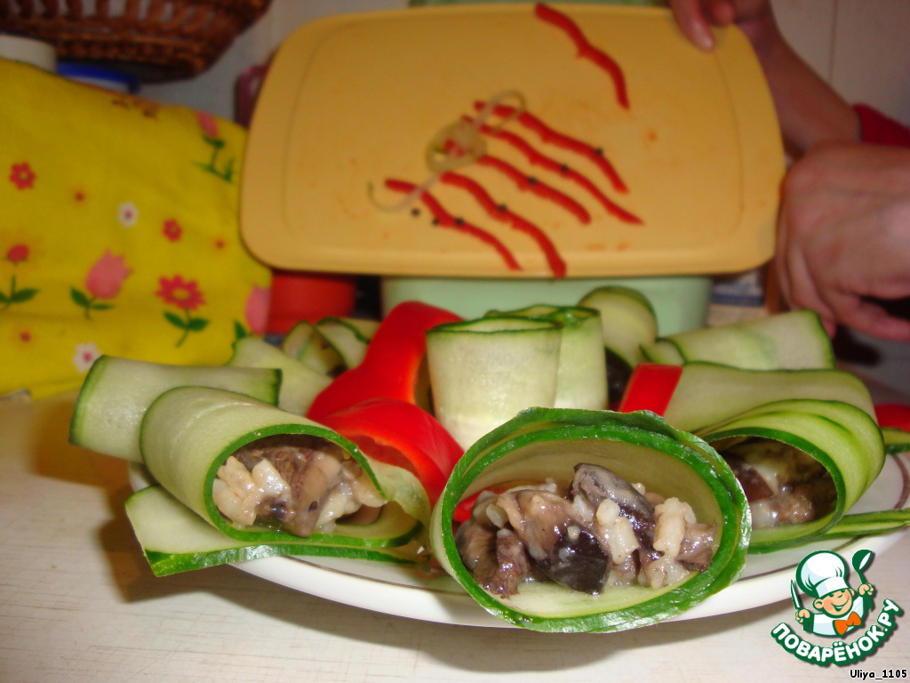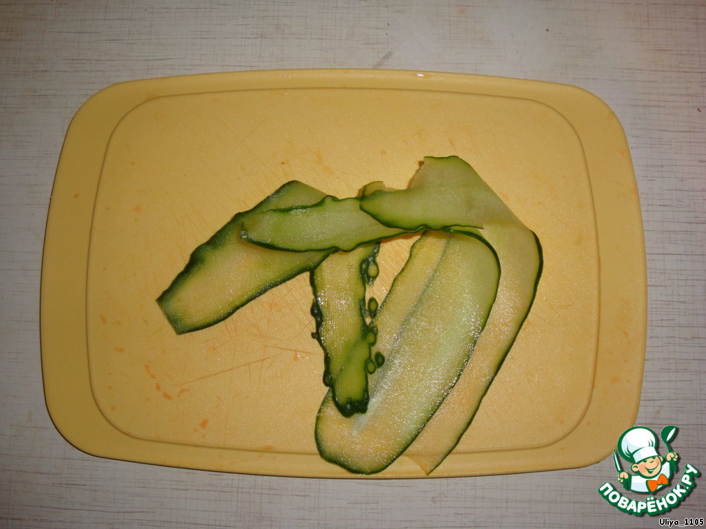 Разложить фаршированные огурцовые рулетики на тарелке, перемежая их с полукольцами перца. В середку поставьте вертикально два огурцовых рулетика, а во внутрь положить по кусочку перца -- два бутона, еще только начинающих раскрываться...