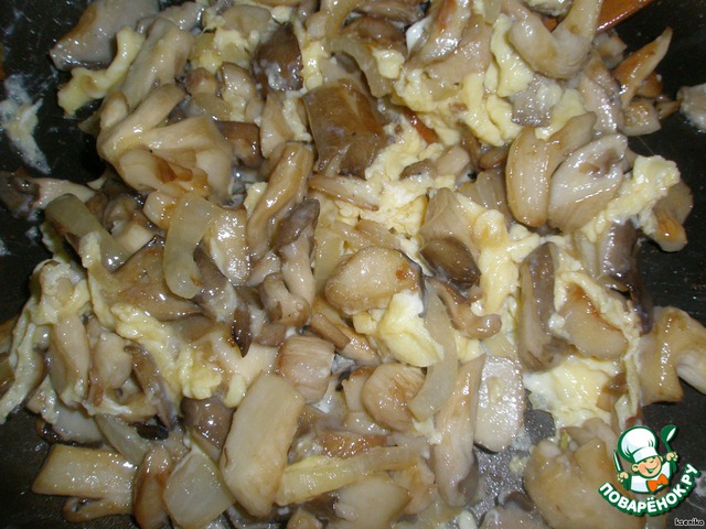 Яйца взбиваем отдельно, добавляем майонез, можно молоко на глаз. Вливаем эту смесь в грибы и жарим до готовности яиц.