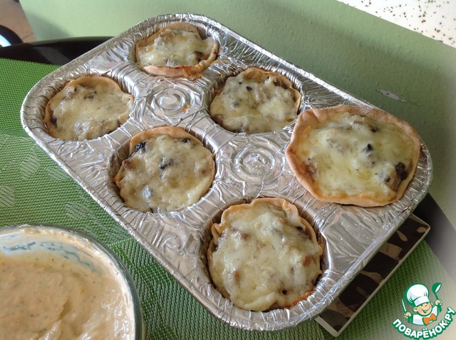 Далее вытаскиваем из духовки и наполняем корзиночки жульеном. Сверху кладем натертый сыр. Снова помещаем в духовку.