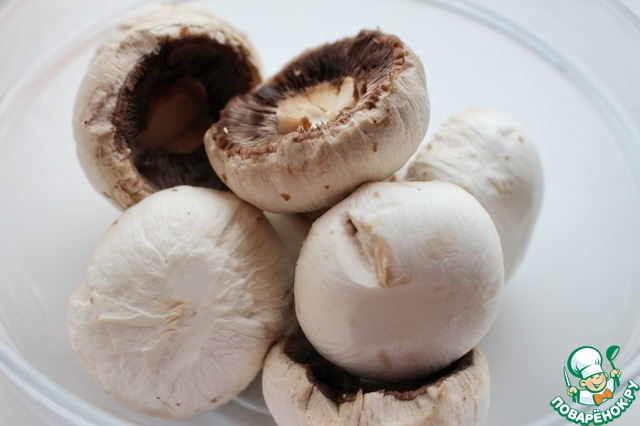 Шляпки шампиньонов почистить. Отделить ножки от шляпок.
