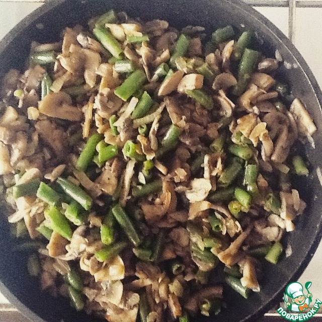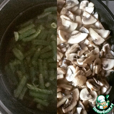 На растительном масле жарим шампиньоны с луком. Фасоль отвариваем 10 мин в подсоленной воде.