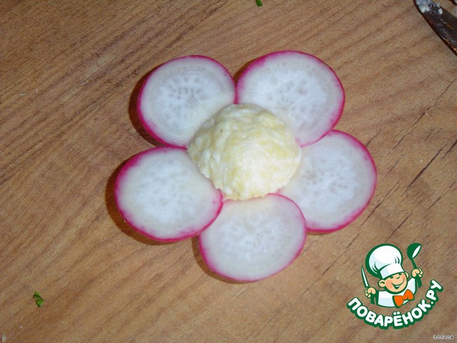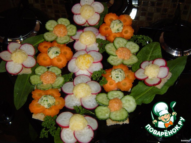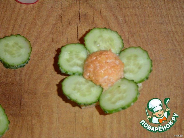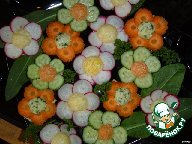 А теперь начинаем творческий процесс украшения.Для этого тонко нарезаем огурец,редис и морковь(поперек) и с их помощью делаем цветочки.