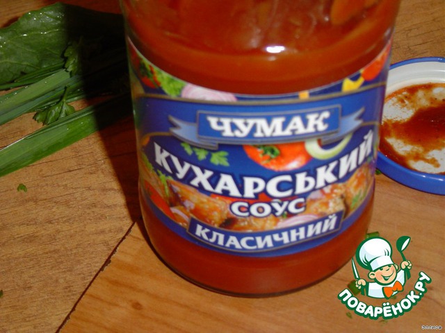 В третью часть добавляем мелко-мелко нашинкованный репчатый лук и красный молотый перец.Заправляем все это томатным соусом.