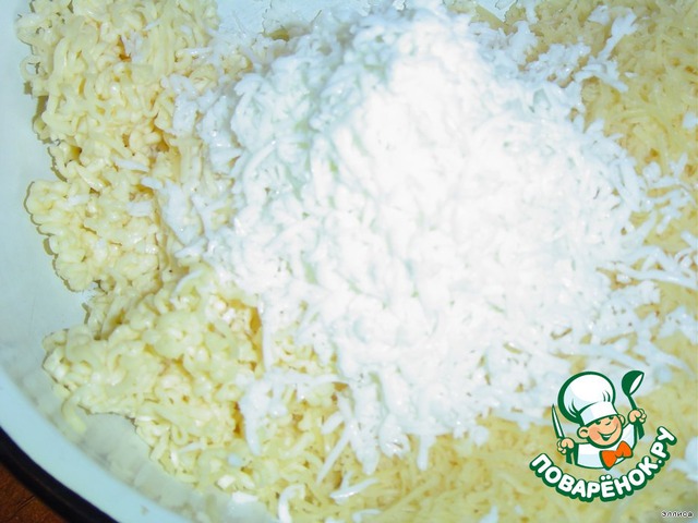 Затем натираем любой твердый сыр и вареные яйца на той же терке.И добавляем мелко нарезанный чеснок.