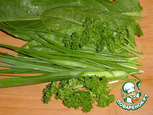 Во вторую часть добавляем мелко нарезанную зелень,а также щавель и шпинат.Заправляем все это сметаной.