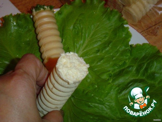Готовим фарш: измельчаем орехи (фундук), твердый сыр, немножко мускатного ореха, чеснок. С помощью комбайна или блендера перетираем эти ингредиенты, добавив туда плавленный сыр и немного майонеза. Соотношение продуктов такое - 1/3 (сыр твердый), 1/3 (сыр плавленный), 1/3 (фундук). Полученной смесью наполняем трубочки.