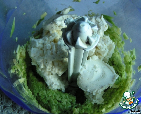 Добавляем творожный сыр, перемешиваем до однородности, можно в том же блендере