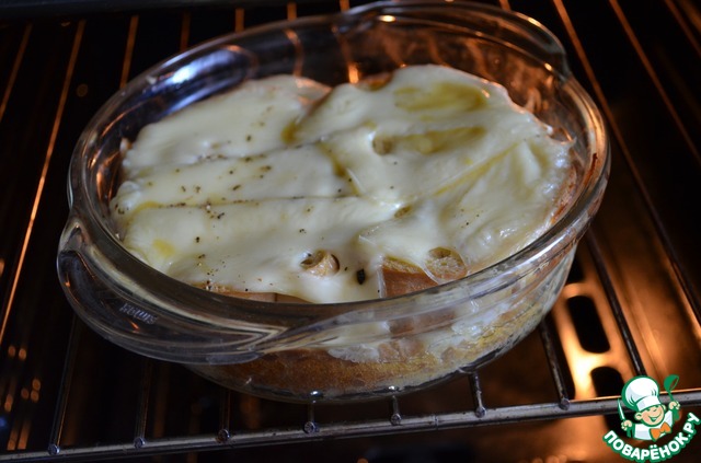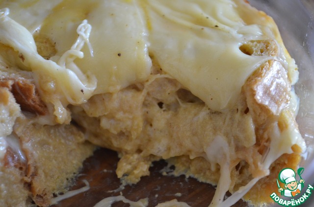 Заливаем смесью хлеб с сыром и ставим в духовку на 15-20 мин. до оплавления сыра, либо-до образования хрустящей корочки (по вкусу).