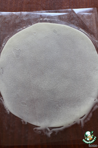Горячий комочек помещаем между двумя силиконовыми ковриками, или между листами пергаментной бумаги, или как я между двумя листиками плотной пленки. И сначала пальцами формируем круг, а затем скалкой раскатываем как можно тоньше.