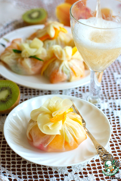 | Что делает наш стол праздничным? Шампанское и изящная закуска к нему! А что к шампанскому лучшая закуска? Сыр и фрукты! Тоненькие, почти прозрачные мешочки из моцареллы, в которые завернут фруктово-сырный салат, смотрятся очень нарядно. По желанию в такие мешочки можно заворачивать любую начинку. Готовятся они просто мгновенно! |