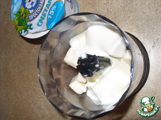 Смешиваем в блендере сыр и 2 столовые ложки сметаны. Взбиваем 30-60 секунд.