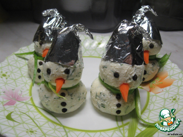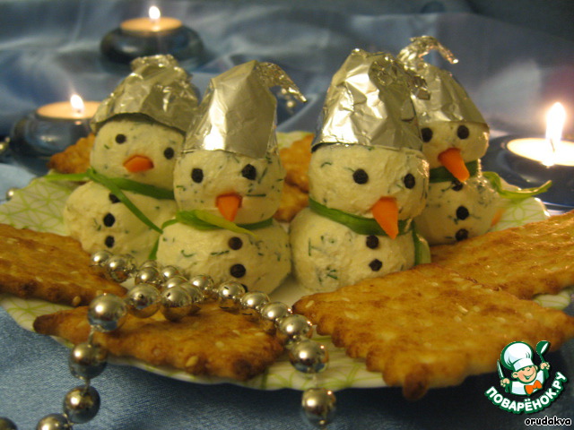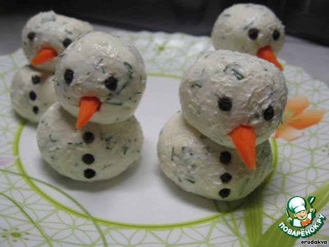 P.S. Снеговичков поставить в холодильник на 1ч. Подавать с крекерами на большом блюде или в использовать качестве украшения блюд.