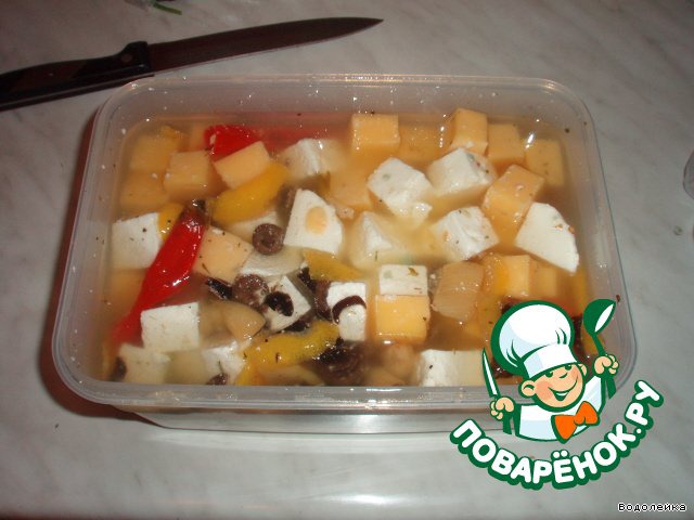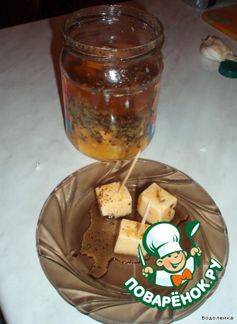 Сыр режем кубиками и заливаем его "маринадом". Закрываем крышкой и даем постоять около суток (можно и меньше).