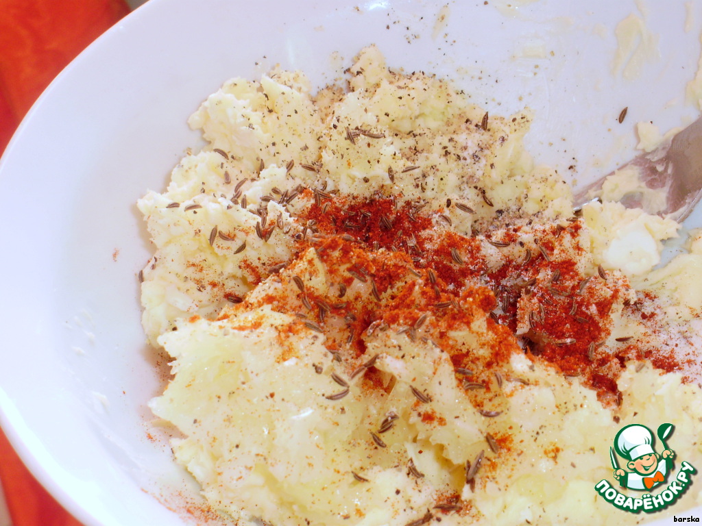 Добавить измельчённый (блендером) лук, тмин (перемалывать его или нет - дело вкуса!), свежемолотые соль, перец и красную паприку. Тщательно перемешать до однородности.