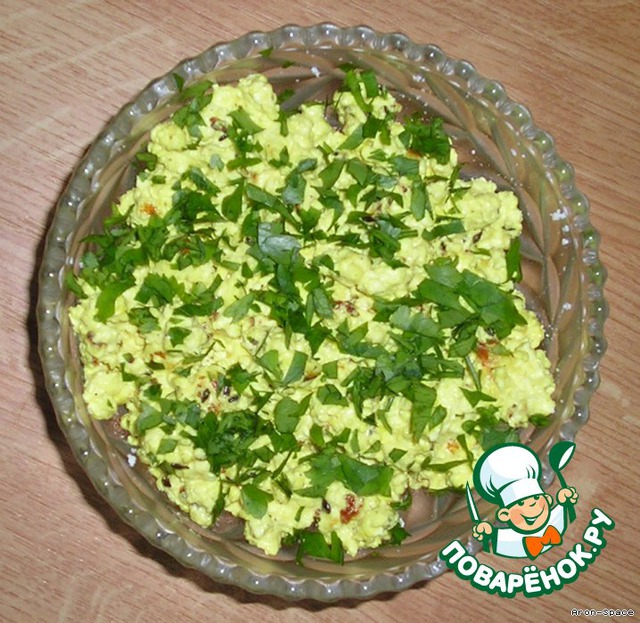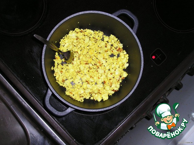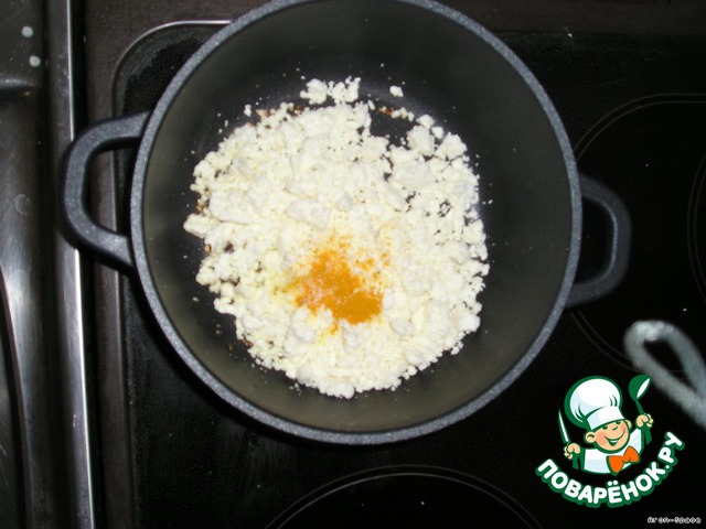 Выкладываем наш "Панир", а сверху высыпаем соль и куркуму. Размешиваем и...