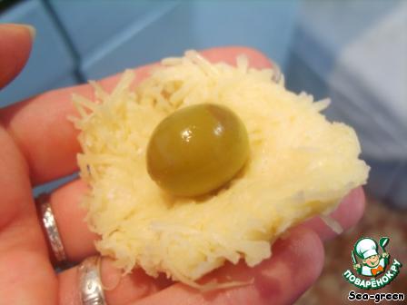 Затем сформировать небольшую лепешку и в середину положить оливку
