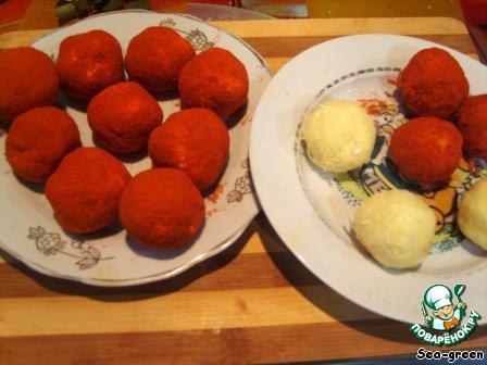 В неглубокую тарелку нужно насыпать паприку и обвалять в ней наши шарики. Три я оставила желтенькими...