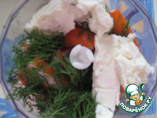 В блендере измельчим крабовые палочки с сыром "Маскарпоне" и сыром "Горгонзола", майонезом, укропом и 1/3 части семги.
