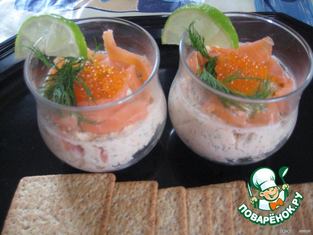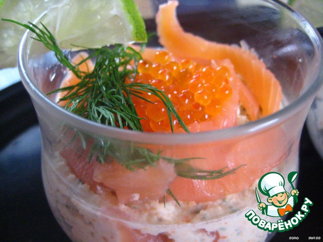 Сверху оставшуюся семгу, нарезанную кусочками, по пол-ложечки икры, украсим укропом и кусочками лайма.